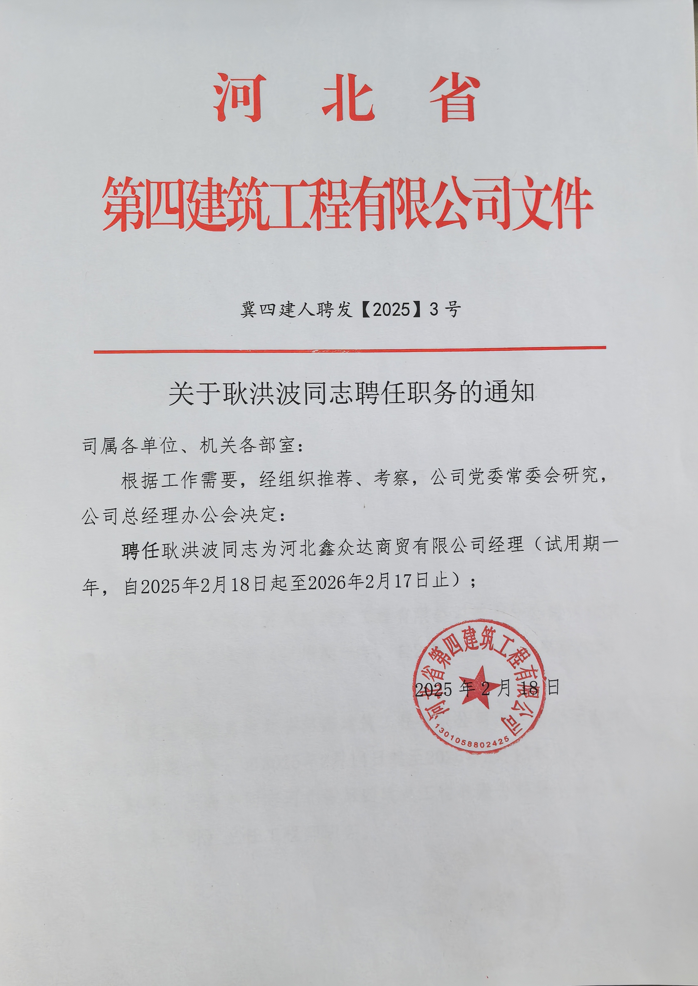 关于耿洪波同志聘任职务的通知
