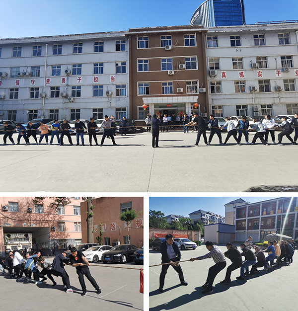 两个分公司的人倾巢而动,大家摩拳擦掌、跃跃欲试。有人说道“我们站在绳子的一边,使劲的时候重心向下,身体向后”。在开始前参赛的人站在绳子的两端兴高采烈的讨论着如何站位、如何使劲。比赛时随着八分公司党总支书记刘东光的一声号令,双方参赛人员齐心协力,拧成一股绳,双脚分开,身体向后倾,脸憋得通红,嘴巴紧闭,紧紧地贴住绳子,拼命向后拉。绳子中间的红绸布一会儿移向四分公司的队伍,一会儿又移向八分公司的队伍,互不相让。加油助威的人挥着胳膊,大声喊着口号,暗暗为比赛的人使劲。终于第一局八分公司队伍不敌四分公司队伍,红绸移向了四分公司队伍,四分公司队伍获得胜利。第二局八分公司队伍从第一局中吸取经验,咬紧牙关,最后取得胜利。第三局双方僵持不下,助威人员蜂拥而上,引得大家笑声连连,最后判了个平局。